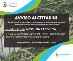 Lunedì 6 Aprile non sarà prevista la raccolta. Le frazioni dell'organico e del fogliame e prato saranno recuperate mercoledì 8 aprile.