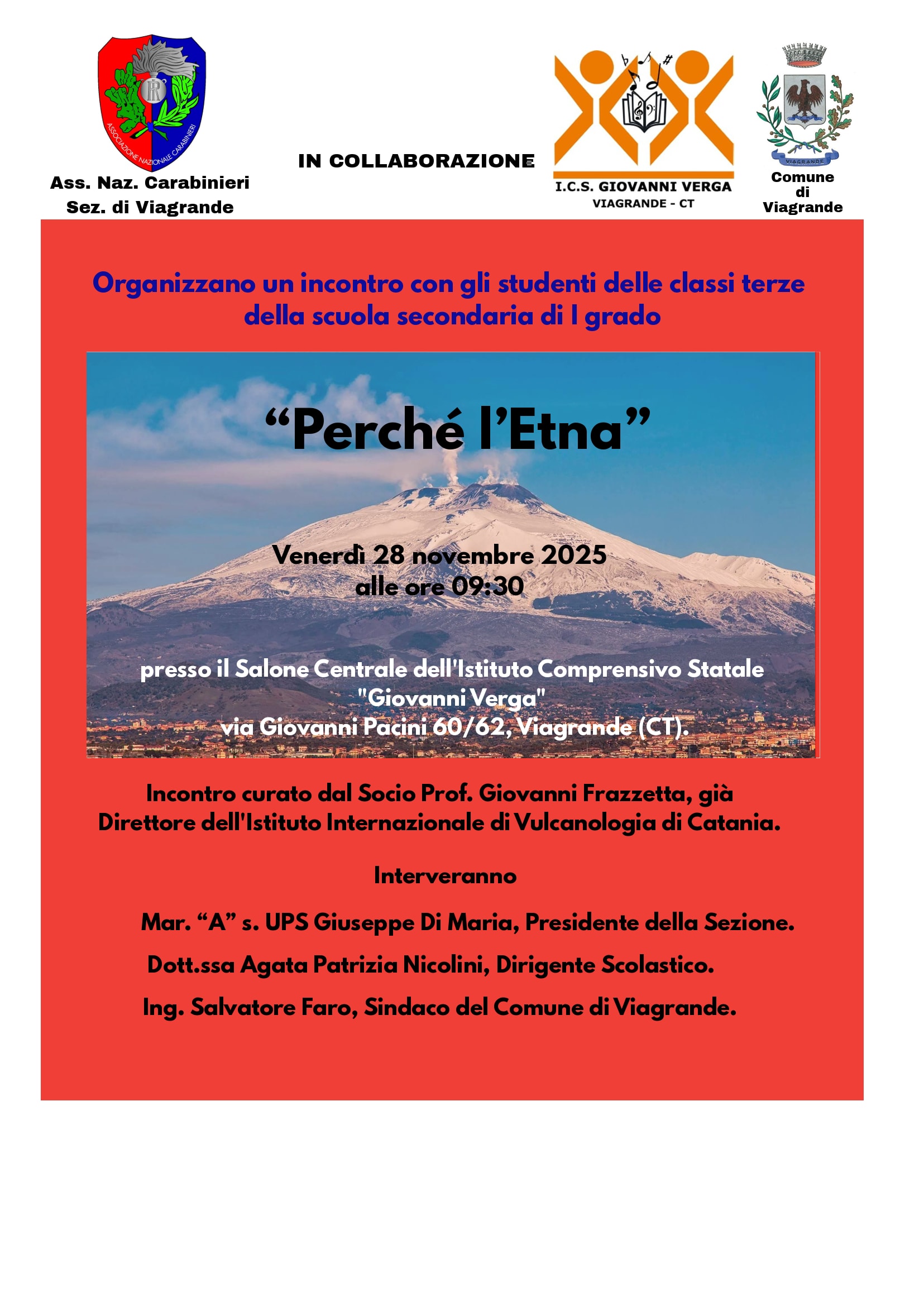 Si comunica che venerdì 28 novembre 2025 presso il Salone Centrale dell’Istituto Comprensivo Statale “Giovanni Verga” si terrà un incontro curato dal Prof. Giovanni Frazzetta, già Direttore dell’Istituto Internazionale di Vulcanologia di Catania e socio dell’Ass. Nazionale Carabinieri sez. di Viagrande, con gli studenti delle classi terze della Scuola Secondaria di I grado sul tema: