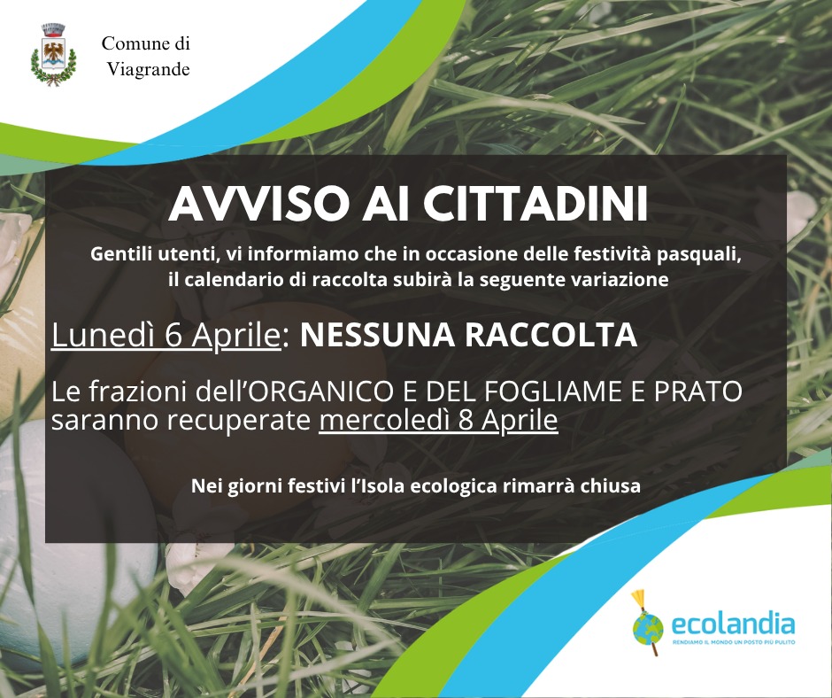 Si comunica ai cittadini che lunedì 6 Aprile, in occasione delle festività pasquali, non vi sarà alcuna raccolta.